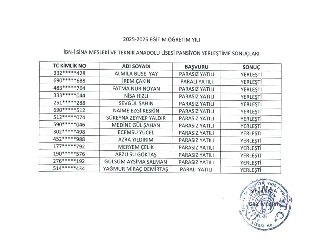 2025-2026 EĞİTİM ÖĞRETİM YILI PANSİYON KAYIT BAŞVURU SONUÇLARI